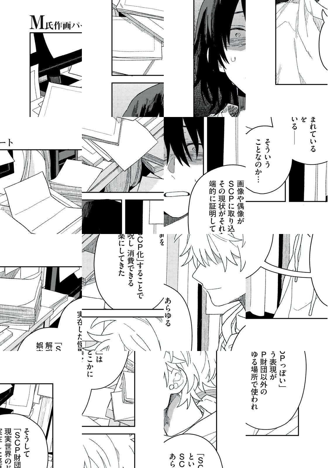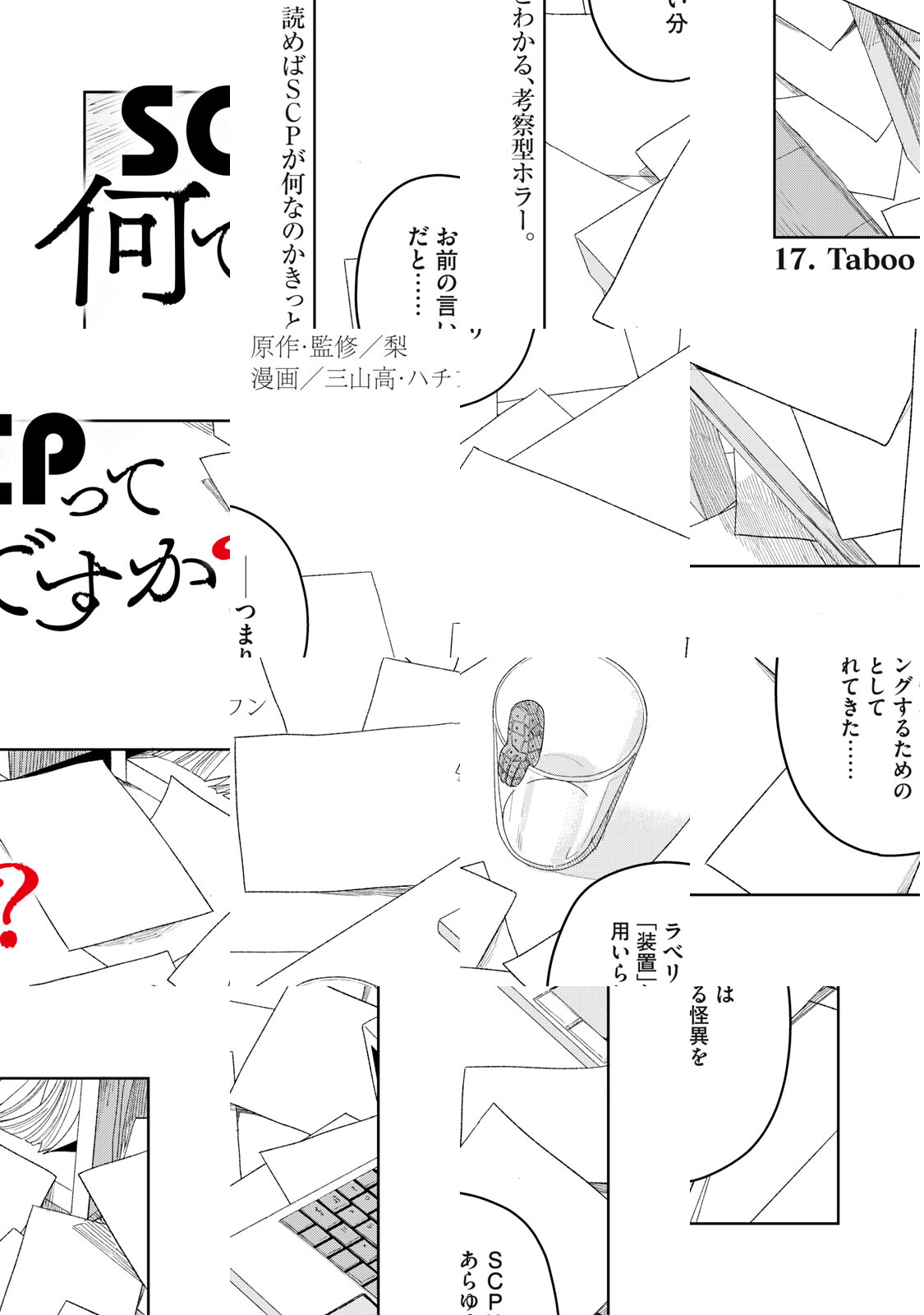 一迅社・comicHOWL編集部から二人の漫画家、MとHのもとに、依頼が届いた。 「インターネット上で人気の『SCP』についてのネーム原作を元に、作画してほしい」 「さらに、『SCP』について入門になる漫画を描いてほしい」 引き受けた二人だったが、そのネーム原作には不明の点が多い。首を傾げながら、Mはホラーに詳しいHにSCPのことを教わりつつ、漫画を描いていく。 Mは入門のパートを担当し、そしてHは、ネーム原作パートの作画を担当する。 WEBホラーの最注目作家・梨、ついに原点回帰。 読めばSCPが何なのかきっとわかる、考察型ホラー ================= 本作のキーヴィジュアルは以下の作品に基づき制作され、CC BY-SA 3.0ライセンスによって公開します SCP Logo ©Aelanna 2009 https://scp-wiki.wikidot.com/dr-mackenzie-s-sketchbook SCP-192-JP「私達のTOKYO」 ©nekomiya_guu 2014 http://scp-jp.wikidot.com/scp-192-jp SCP-040-JP「ねこですよろしくおねがいします」 ©Ikr_4185 2014 http://scp-jp.wikidot.com/scp-040-jp SCP-049「ペスト医師」 ©Gabriel_Jade, djkaktus 2019 http://scp-jp.wikidot.com/scp-049 ※改稿後の記事を参照 SCP-6666「魔性のヘクトールと恐怖のティターニア」 ©djkaktus 2021 http://scp-jp.wikidot.com/scp-6666 ********************