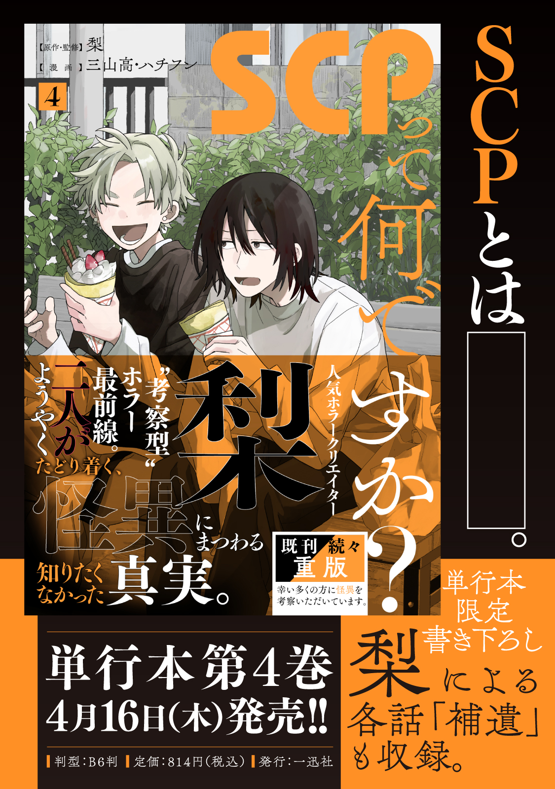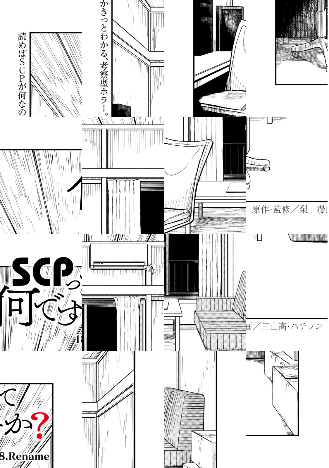 一迅社・comicHOWL編集部から二人の漫画家、MとHのもとに、依頼が届いた。 「インターネット上で人気の『SCP』についてのネーム原作を元に、作画してほしい」 「さらに、『SCP』について入門になる漫画を描いてほしい」 引き受けた二人だったが、そのネーム原作には不明の点が多い。首を傾げながら、Mはホラーに詳しいHにSCPのことを教わりつつ、漫画を描いていく。 Mは入門のパートを担当し、そしてHは、ネーム原作パートの作画を担当する。 WEBホラーの最注目作家・梨、ついに原点回帰。 読めばSCPが何なのかきっとわかる、考察型ホラー ================= 本作のキーヴィジュアルは以下の作品に基づき制作され、CC BY-SA 3.0ライセンスによって公開します SCP Logo ©Aelanna 2009 https://scp-wiki.wikidot.com/dr-mackenzie-s-sketchbook SCP-192-JP「私達のTOKYO」 ©nekomiya_guu 2014 http://scp-jp.wikidot.com/scp-192-jp SCP-040-JP「ねこですよろしくおねがいします」 ©Ikr_4185 2014 http://scp-jp.wikidot.com/scp-040-jp SCP-049「ペスト医師」 ©Gabriel_Jade, djkaktus 2019 http://scp-jp.wikidot.com/scp-049 ※改稿後の記事を参照 SCP-6666「魔性のヘクトールと恐怖のティターニア」 ©djkaktus 2021 http://scp-jp.wikidot.com/scp-6666 ********************