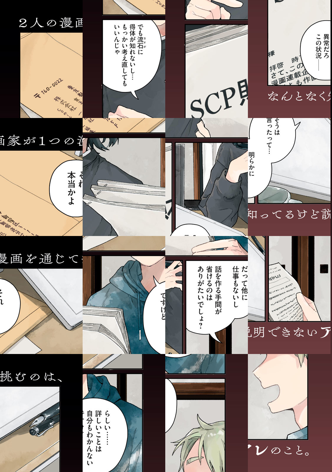 一迅社・comicHOWL編集部から二人の漫画家、MとHのもとに、依頼が届いた。 「インターネット上で人気の『SCP』についてのネーム原作を元に、作画してほしい」 「さらに、『SCP』について入門になる漫画を描いてほしい」 引き受けた二人だったが、そのネーム原作には不明の点が多い。首を傾げながら、Mはホラーに詳しいHにSCPのことを教わりつつ、漫画を描いていく。 Mは入門のパートを担当し、そしてHは、ネーム原作パートの作画を担当する。 WEBホラーの最注目作家・梨、ついに原点回帰。 読めばSCPが何なのかきっとわかる、考察型ホラー ================= 本作のキーヴィジュアルは以下の作品に基づき制作され、CC BY-SA 3.0ライセンスによって公開します SCP Logo ©Aelanna 2009 https://scp-wiki.wikidot.com/dr-mackenzie-s-sketchbook SCP-192-JP「私達のTOKYO」 ©nekomiya_guu 2014 http://scp-jp.wikidot.com/scp-192-jp SCP-040-JP「ねこですよろしくおねがいします」 ©Ikr_4185 2014 http://scp-jp.wikidot.com/scp-040-jp SCP-049「ペスト医師」 ©Gabriel_Jade, djkaktus 2019 http://scp-jp.wikidot.com/scp-049 ※改稿後の記事を参照 SCP-6666「魔性のヘクトールと恐怖のティターニア」 ©djkaktus 2021 http://scp-jp.wikidot.com/scp-6666 ********************