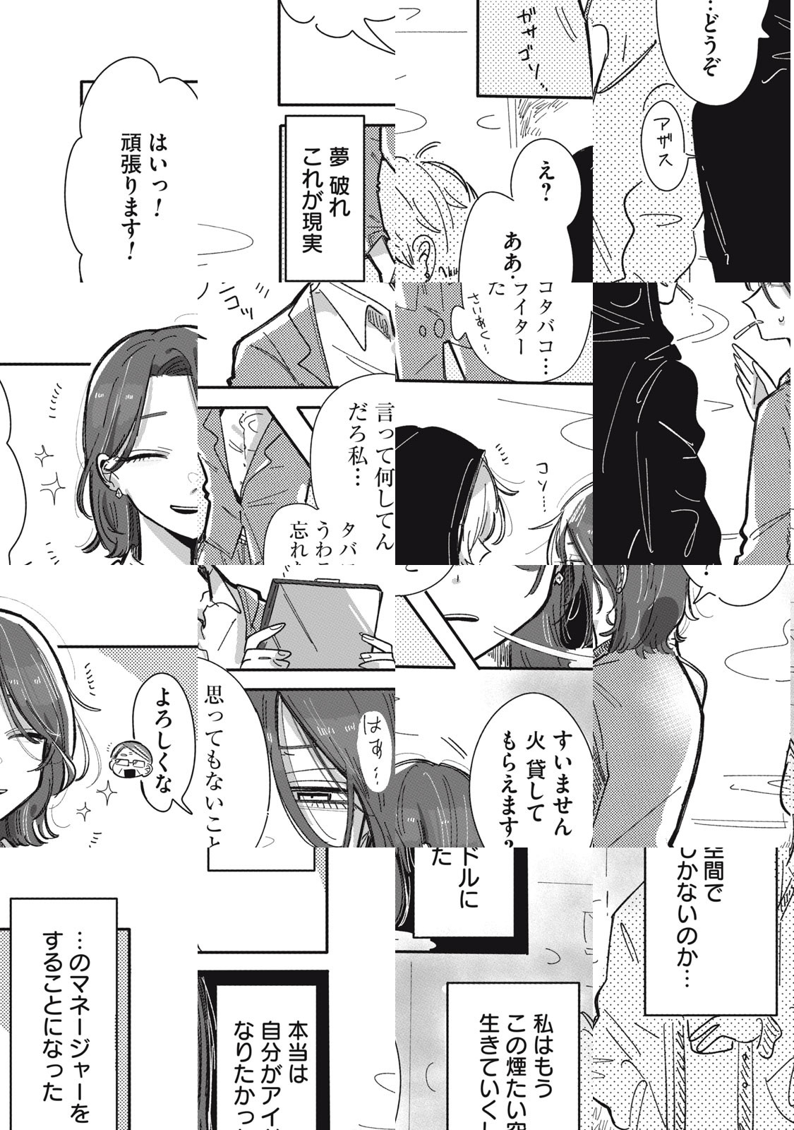 仕方なくマネージャーになって、 初めて担当する大人気アイドルまろんには 裏の顔があった...。 舞台上でキラキラしているまろんだが、 私生活ではタバコが手放せない、世話の焼ける変わった女の子。 「完璧なアイドル」まろんの素顔を隠し通すために、 マネージャーとしてサポートしなければ! 裏ありアイドル×世話好きマネージャー 喫煙所から始まる、二人の物語ーー。