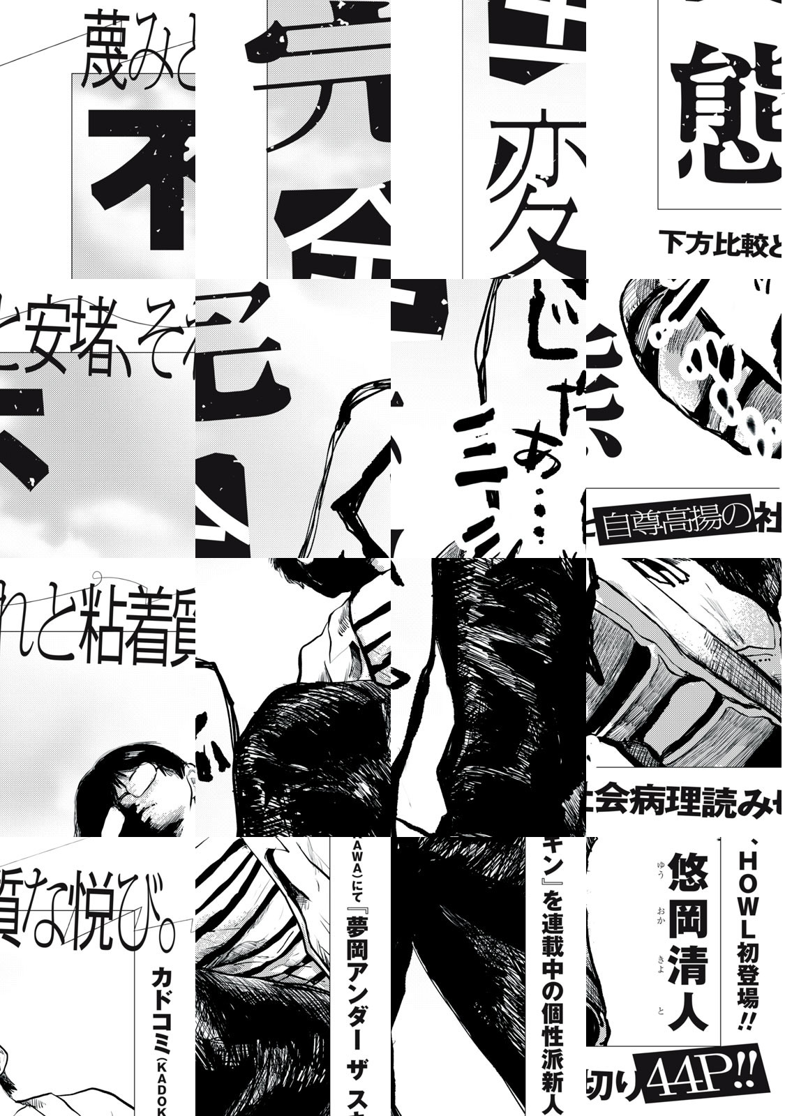 カドコミ(KADOKAWA)にて『夢岡アンダー ザ スキン』を連載中の個性は新人、HOWL初登場!! 現代に蔓延する下方比較&自尊高揚(自分より下を見て安心する心理)を描いた社会病理読み切り44p!!