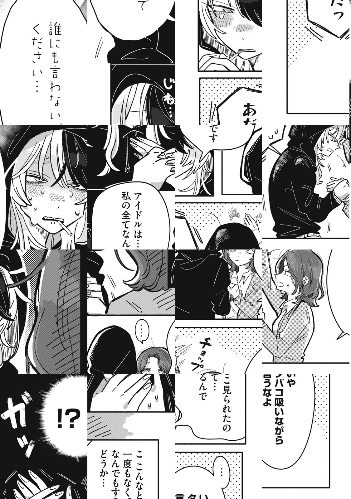 仕方なくマネージャーになって、 初めて担当する大人気アイドルまろんには 裏の顔があった...。 舞台上でキラキラしているまろんだが、 私生活ではタバコが手放せない、世話の焼ける変わった女の子。 「完璧なアイドル」まろんの素顔を隠し通すために、 マネージャーとしてサポートしなければ! 裏ありアイドル×世話好きマネージャー 喫煙所から始まる、二人の物語ーー。