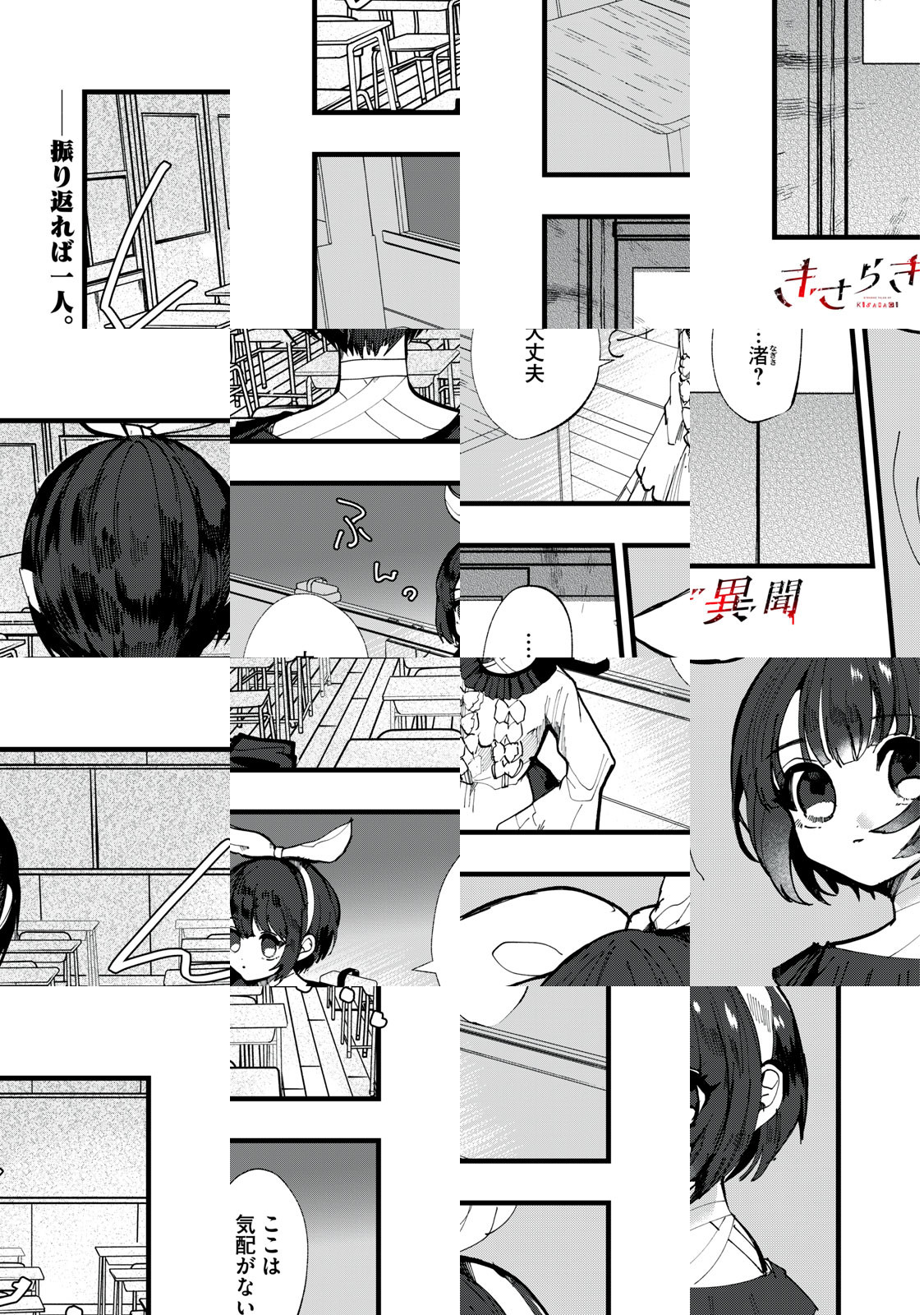 悪意、無意識、都市伝説――あらゆる闇が人を蝕む音楽と物語の交差点!! 家庭と学校の両方で壮絶な環境に身を置く少女・渚。 音楽を通したSNSの人間関係に依存してい彼女の日常は、いつもの駅で謎の少女とすれ違うと共に突如奇怪な世界に変貌する。 迷い込んだのは「きさらぎ駅」、かって掲示板で有名になった都市伝説であった。 命を狙う怪異たちを退けるにつれて露になる目を逸らしたくなる真実とは…!?