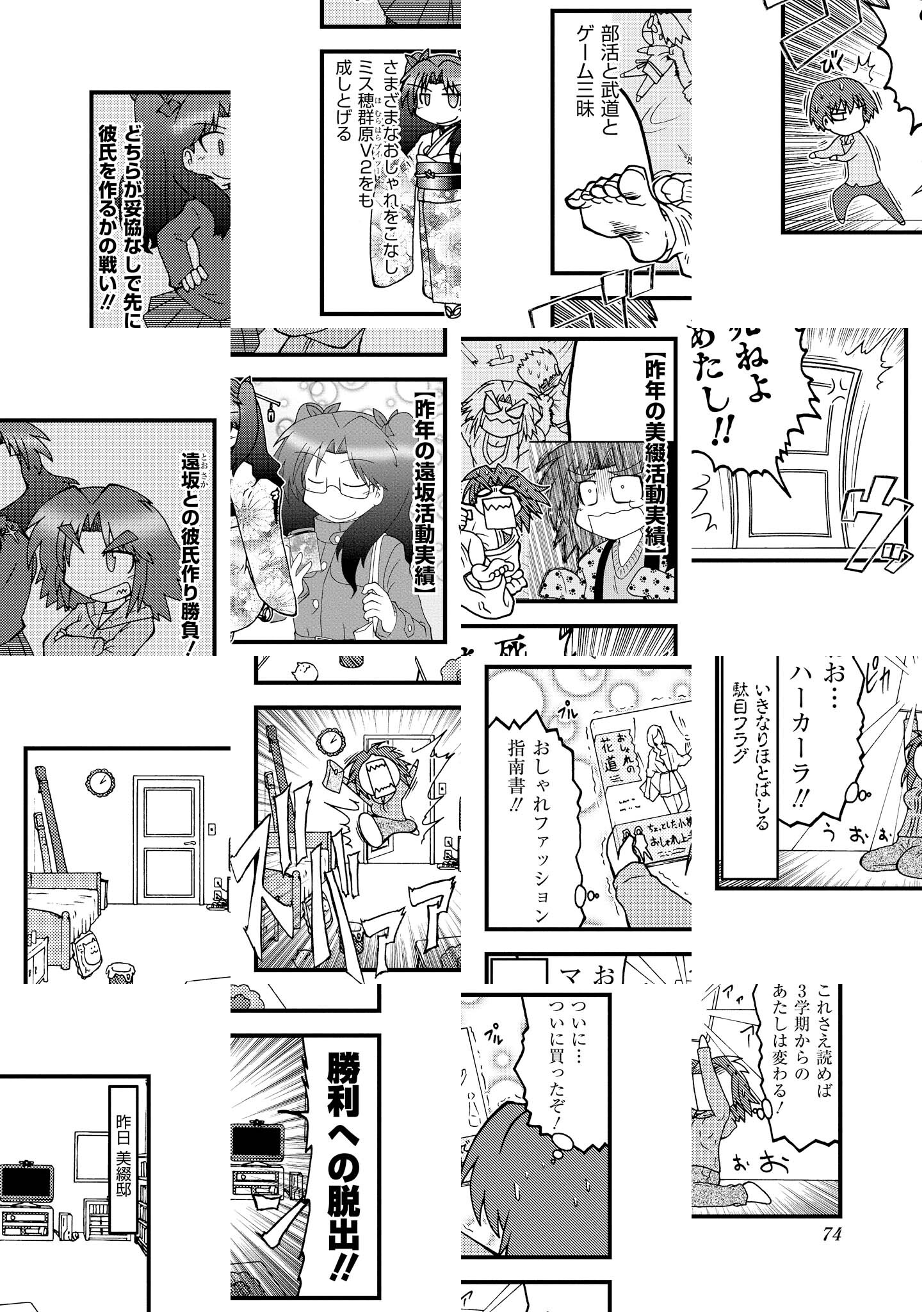 大人気ゲームソフト『Fate/stay night』と『Fate/hollow ataraxia』が4コマになって単行本登場!とはいっても主人公となるのは本編中に脇役どころかチョイ役でしかなかった冷静沈着な眼鏡っ娘・氷室鐘、穂群原の黒豹・蒔寺楓、未婚の良妻賢母・三枝由紀香らおよそ聖杯戦争とは全く無縁の面々。読んだ方はもしかしたら「え?キン肉マソ?ツグルイ?孤独のグノレメ?」と思われるかもしれませんが、いいえ、Fateです。