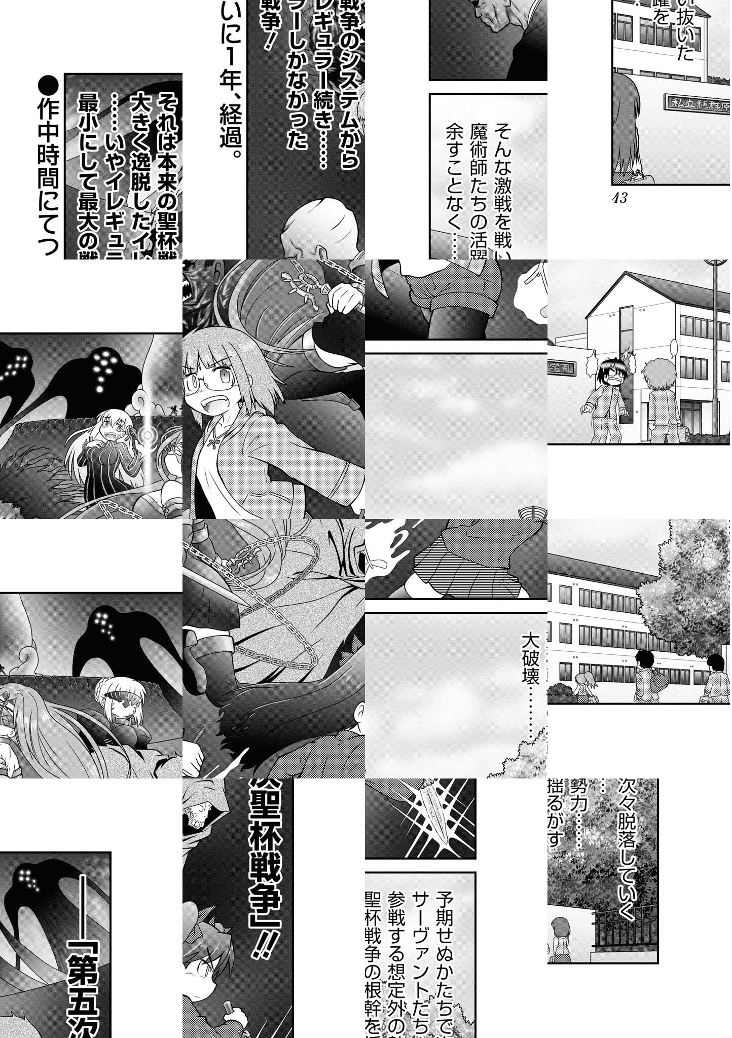 大人気ゲームソフト『Fate/stay night』と『Fate/hollow ataraxia』が4コマになって単行本登場!とはいっても主人公となるのは本編中に脇役どころかチョイ役でしかなかった冷静沈着な眼鏡っ娘・氷室鐘、穂群原の黒豹・蒔寺楓、未婚の良妻賢母・三枝由紀香らおよそ聖杯戦争とは全く無縁の面々。読んだ方はもしかしたら「え?キン肉マソ?ツグルイ?孤独のグノレメ?」と思われるかもしれませんが、いいえ、Fateです。