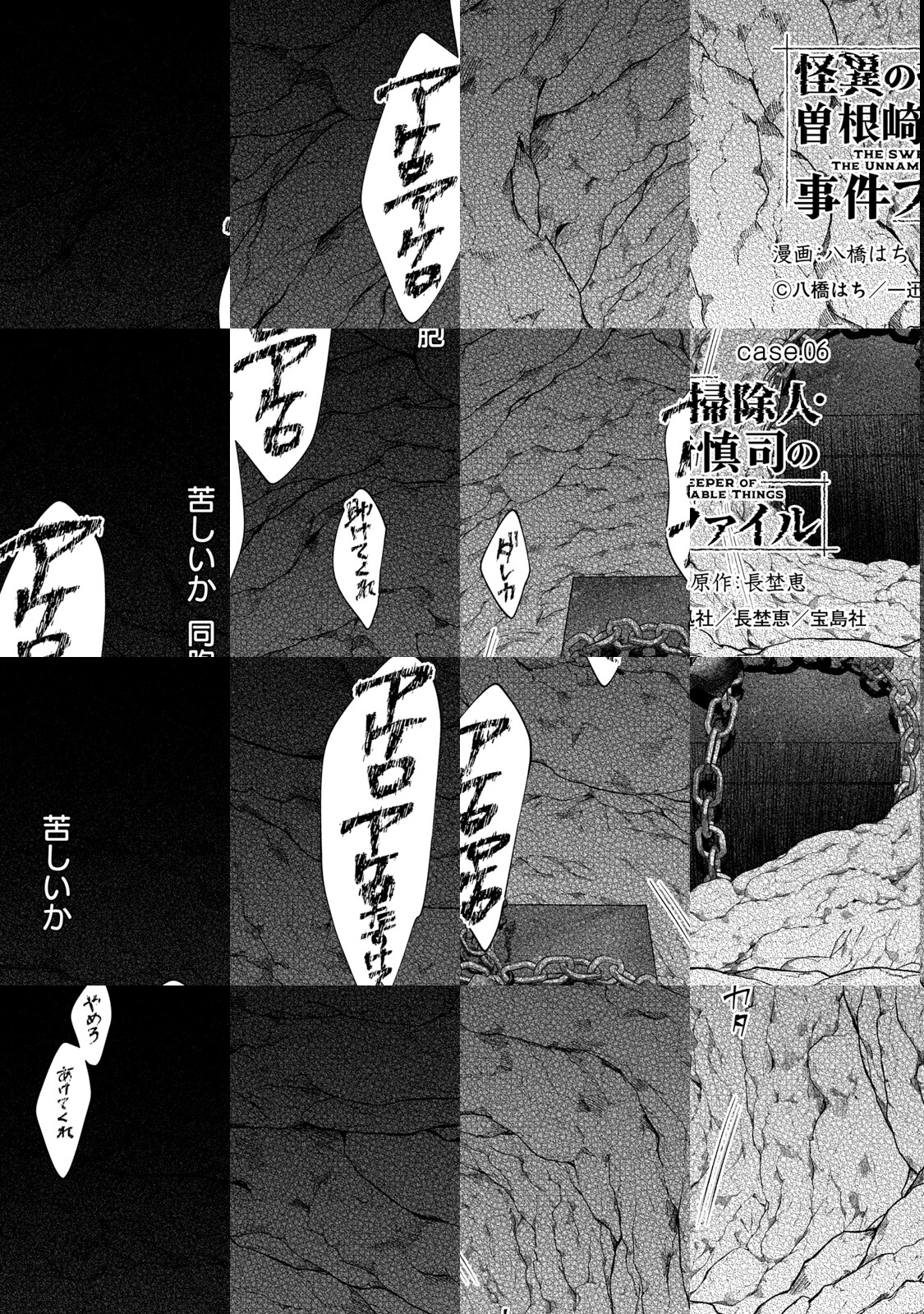 名状しがたいオカルト事件 這い寄る■■はすぐそこにある 怪しげな男、曽根崎 慎司は、警察では手に余る名状しがたい怪事件を請け負う「怪異の掃除人」そんな彼のもとでアルバイトをする竹田 景清も、不可解な事件に巻き込まれていく 信じていた世界が覆るような、冒涜的な狂気に触れた先には何がある―― 這い寄る怪異にあらがうコズミックホラーサスペンス、開幕 ©八橋はち/一迅社/長埜恵/宝島社